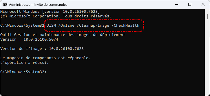 Si vous recevez le message : « La protection des ressources Windows a trouvé des fichiers endommagés mais n'a pas pu en réparer certains », passez à la réparation DISM en exécutant la commande suivante :
