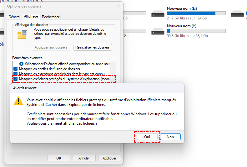 Étape 4. Décochez "Masquer les fichiers protégés du système d'exploitation (recommandé)", et vous recevrez un avertissement, cliquez simplement sur "Oui" pour confirmer.