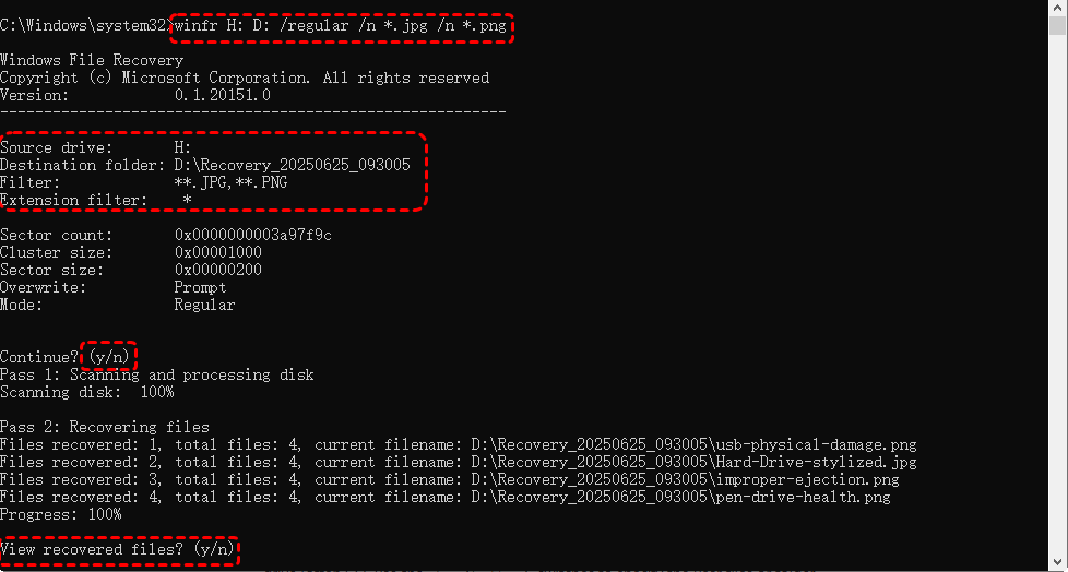 さらに、Windows File Recoveryは特定のファイル、フォルダ、ファイルタイプの復元もサポートしています。基本的なWindows File Recoveryコマンドの後にフィルターコマンドを追加するだけです。例えば、削除した画像ファイルを復元したい場合は、次のコマンドを入力します:winfr H: D: /regular /n *.jpg /n *.png