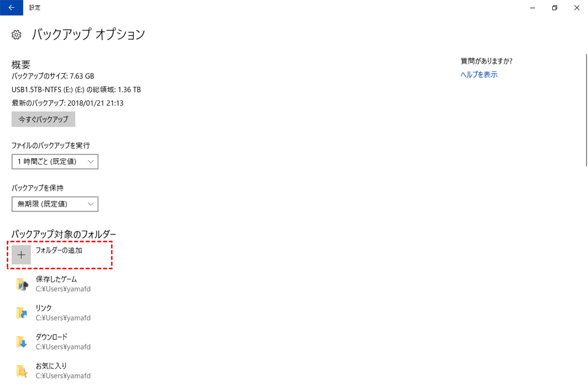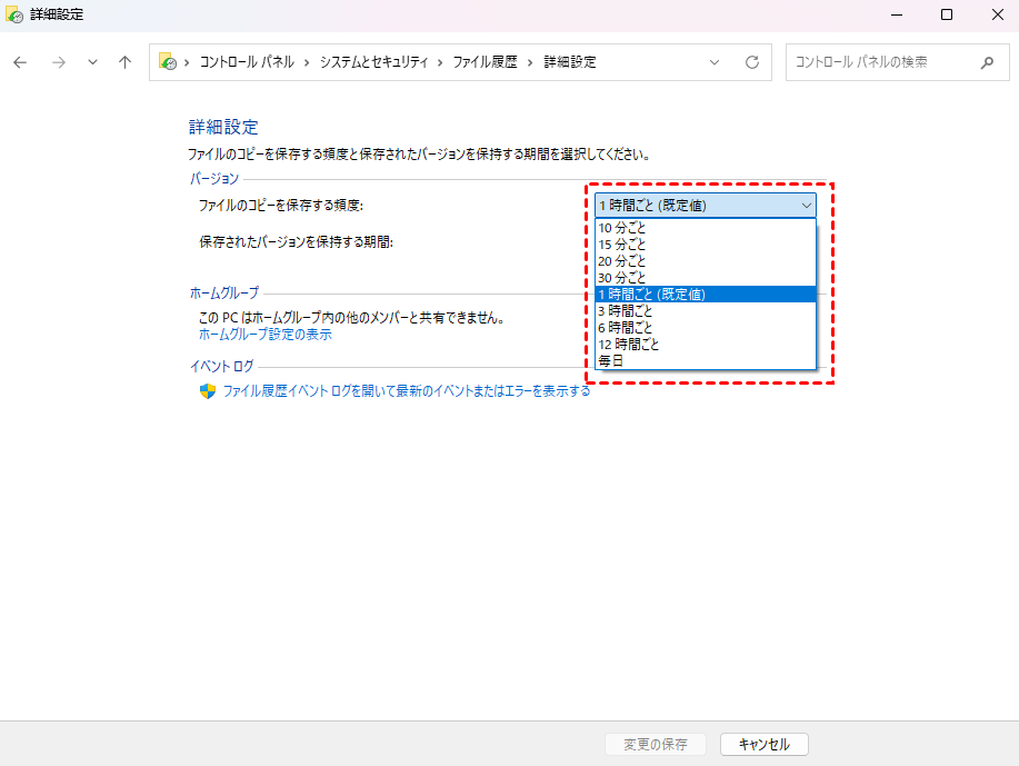 ファイル履歴のデフォルトのバックアップ頻度