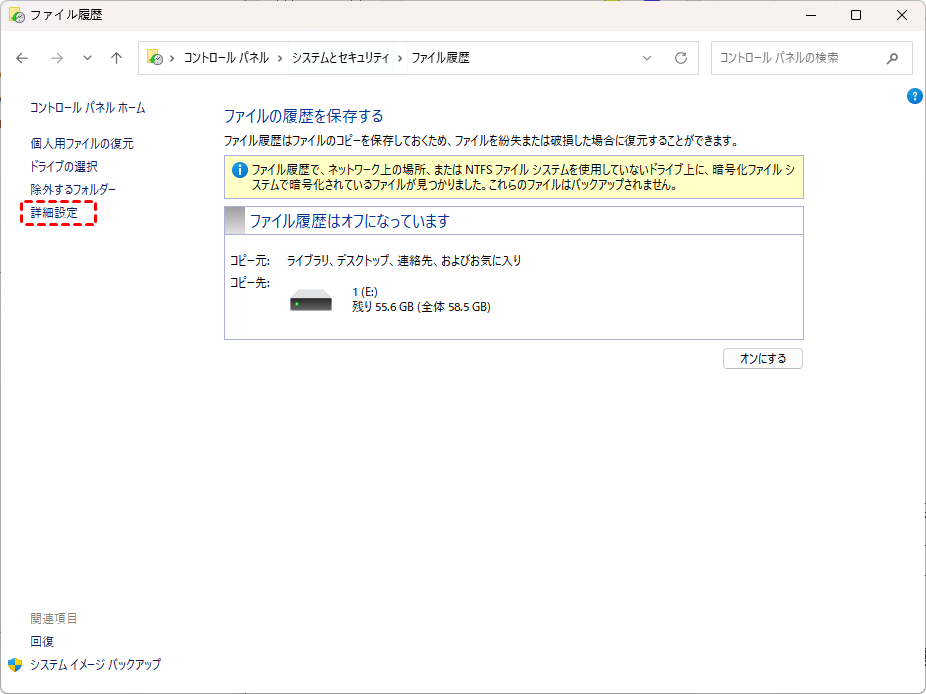 ファイル履歴は以下を対象とします: