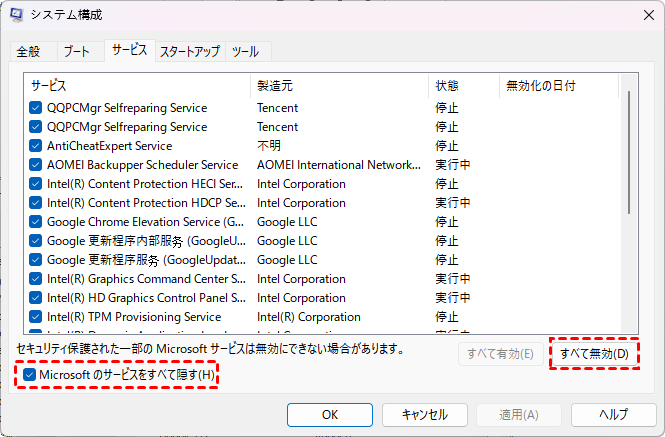 ステップ 2. 「サービス」タブで、「すべてのMicrosoftサービスを隠す」にチェックを入れ、「すべて無効にする」をクリックして、Microsoft以外のすべてのサービスをオフにします。次に、「適用」と「OK」をクリックして変更を保存します。