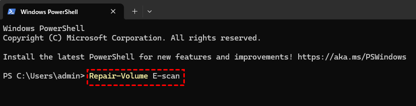 ステップ 2. 次のコマンド「Repair-Volume E[ドライブレター]-scan」を入力し、「Enter」キーを押します。ドライブレター「E」は実際のドライブレターに置き換えてください。