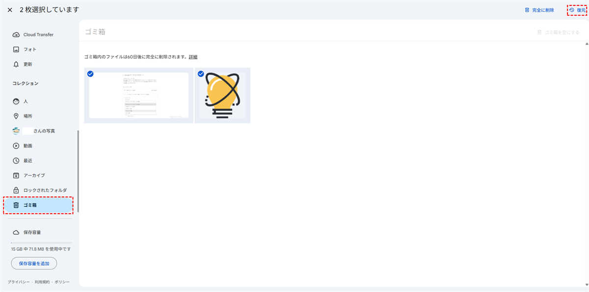 DCIMフォルダがGoogleフォトと同期されていた場合、削除した写真や動画をクラウドバックアップから直接復元できます。