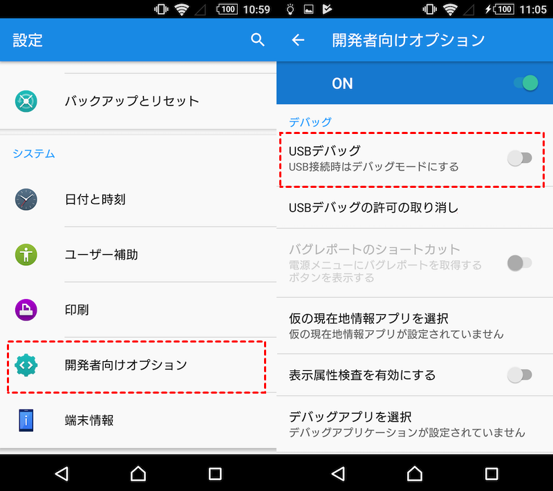 ステップ 1:「設定」>「端末情報」へ進み、「ビルド番号」を7回タップして「開発者向けオプション」を解除します。「設定」>「開発者向けオプション」へ進み、「USBデバッグ」を有効にします。