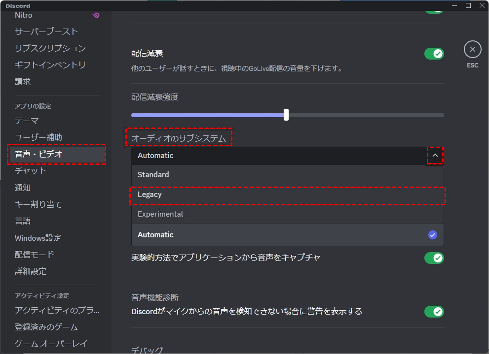場合によっては、Discordのデフォルトのオーディオサブシステム(標準)が特定のハードウェアやドライバーと十分に連携せず、RTC接続や音声の問題を引き起こすことがあります。オーディオサブシステムを「レガシー」に切り替えることで互換性が回復し、「RTC接続中」の問題が解決される可能性があります。