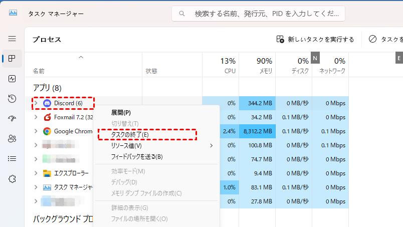 場合によっては、Discordを再起動するだけで解決します。アプリを完全に閉じてください。Windowsではタスクマネージャー(「Ctrl+Shift+Esc」を押し、プロセスからDiscordを探して「タスクの終了」をクリック)、モバイル端末ではバックグラウンドアプリを確認して、バックグラウンドで動作していないことを確認します。