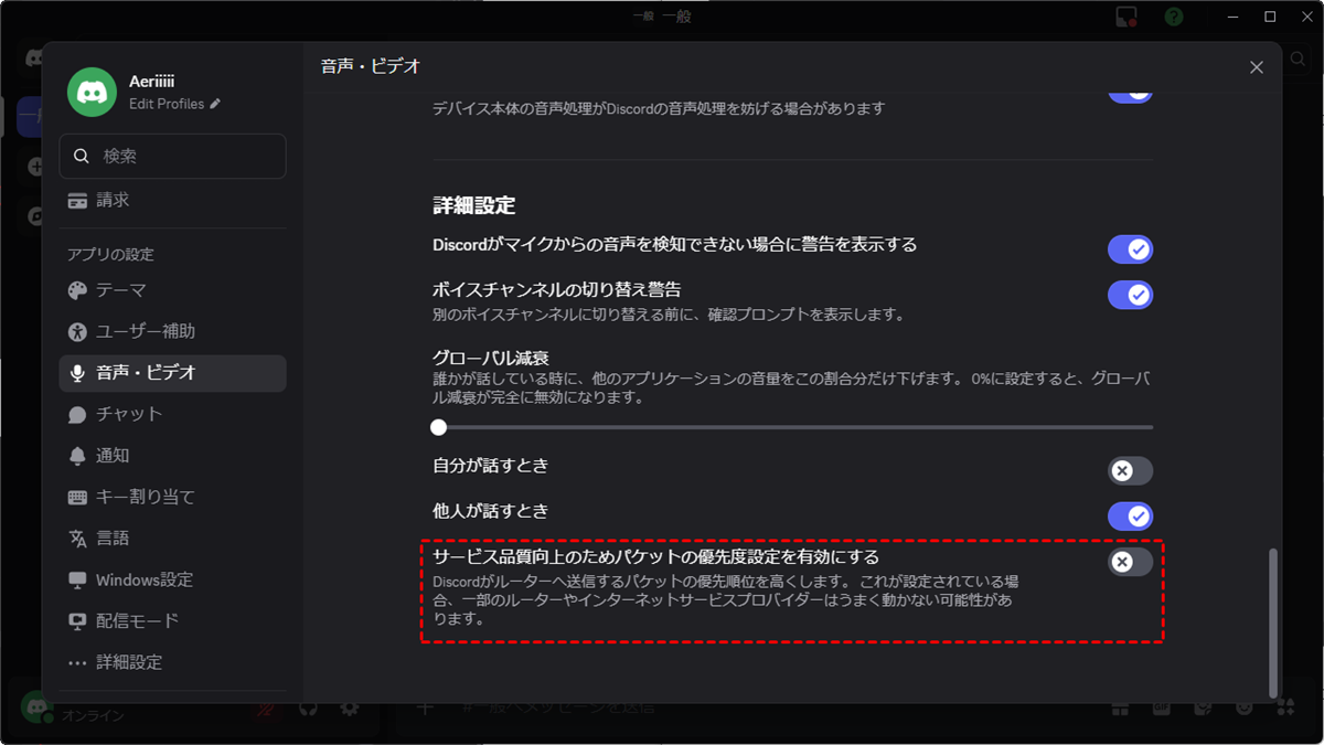 DiscordのQoS(サービス品質)機能がRTC接続に干渉し、「RTC接続中」の問題を引き起こす場合があります。QoS高パケット優先度を一時的に無効にすることで、RTC接続の問題が解決するか確認できます。