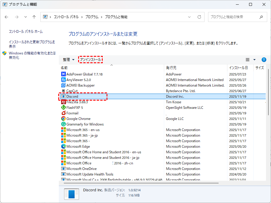 上記の手順で「DiscordがRTC接続中で止まり続ける」問題が解決しない場合、Discordの再インストールは、問題の原因となっている可能性がある破損したファイルや設定を修正するのに役立ちます。「コントロールパネル」を開き、「プログラム」をクリックします。インストールされているプログラムの一覧からDiscordを見つけ、クリックして、「アンインストール」を選択します。