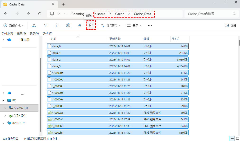破損したキャッシュファイルが原因で、Discordがボイスチャンネル(RTC)に接続できなくなる場合があります。この問題を解決するには、まずDiscordを完全に終了してください。次に、「Windows+R」キーを押し、「%appdata%」と入力してEnterキーを押すと、Roamingフォルダが開きます。その中から「Discord」フォルダを見つけ、その中の「Cache」サブフォルダを開き、フォルダ内のすべてのファイルを削除してください。完了したら、Discordを再起動し、再度ボイスチャンネルに参加してみてください。