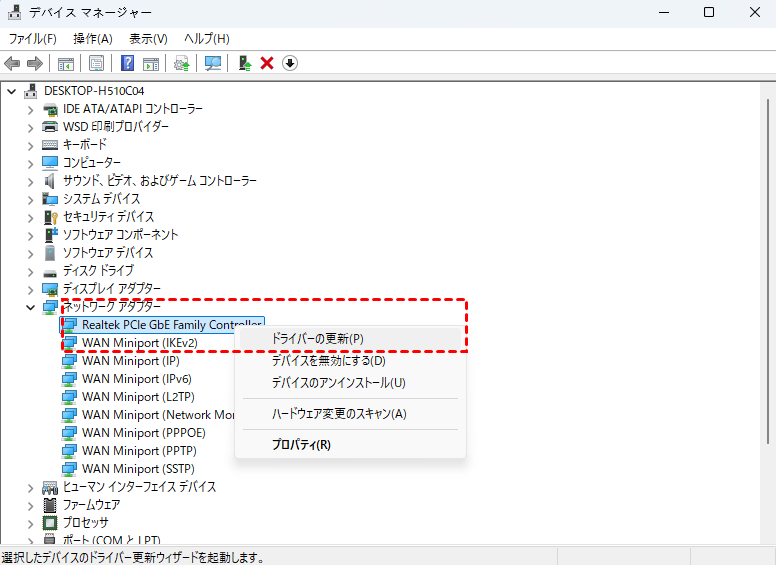 ステップ 3:使用中のネットワークアダプター(例:Intel(R) Ethernet Connection や Realtek Wi-Fi Adapterなど)を右クリックし、「ドライバーの更新」を選択します。