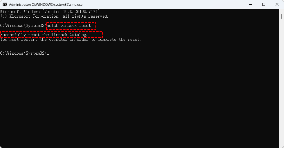 ステップ 3:「Successfully reset the Winsock Catalog」というメッセージが表示されるまで待ちます。