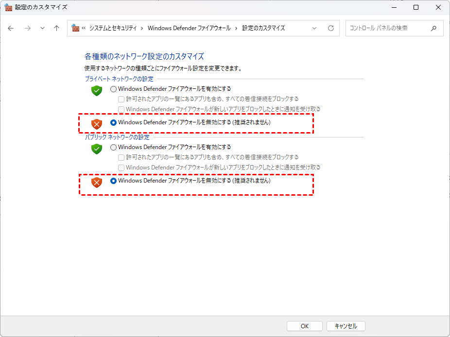 ステップ 4:「プライベートネットワークの設定」と「パブリックネットワークの設定」の両方で「Windows Defenderファイアウォールを無効にする」を選択します。