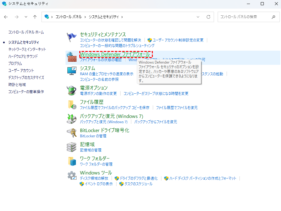 ステップ 2:「システムとセキュリティ」>「Windows Defenderファイアウォール」の順にクリックします。