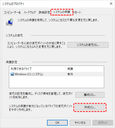 Windowsの検索バーに「復元ポイントの作成」と入力し、アップグレード前に手動で設定します。
