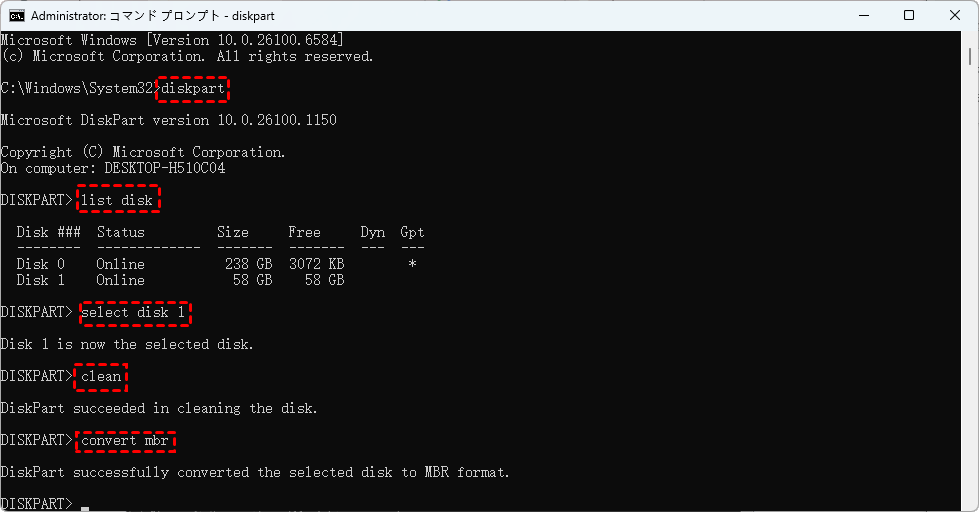 convert mbr(またはconvert gpt、ご自身の要件に基づいて選択してください)