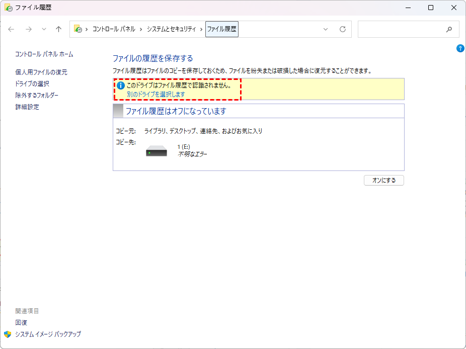 - ファイル履歴が無効化されている:誤ってファイル履歴を無効にすると、システムが対象ドライブを見つけられなくなります。
