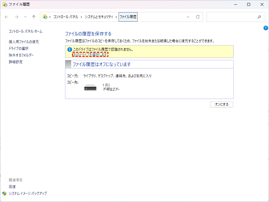 「このドライブはファイル履歴で認識されません」が発生する理由
