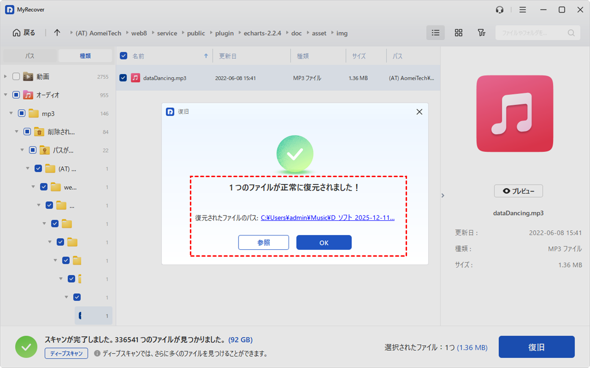 プロセスが完了したら、保存先フォルダのパスをクリックするか、「参照」ボタンから回復したファイルにアクセスできます。
