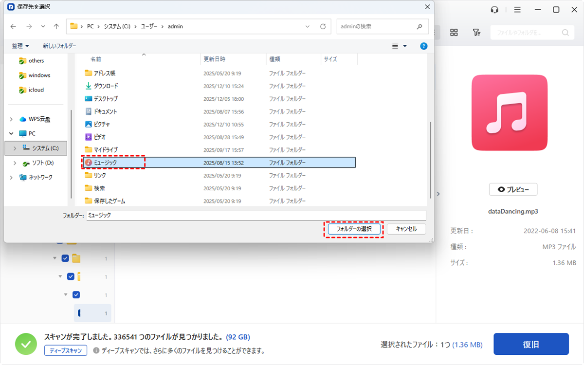 復元したファイルは、データ上書きを避けるため、元のドライブには保存しないでください。