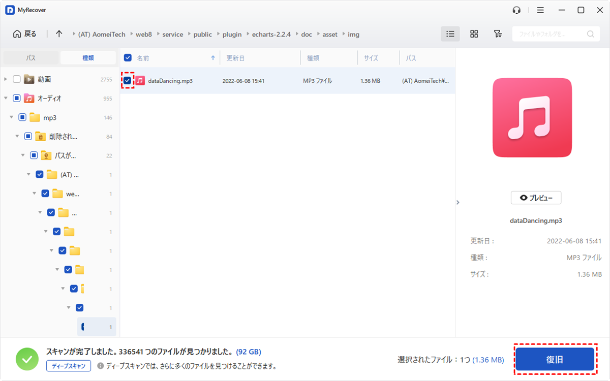 ステップ 3:復元可能なリストから復元したいファイルを選択し、「復旧」をクリックします。