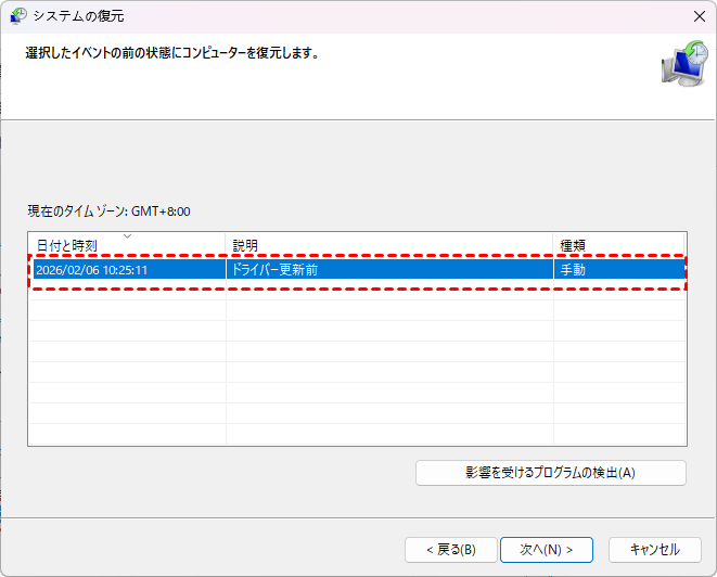 ステップ 3. 「次へ」をクリックし、問題発生前に作成された復元ポイントを一覧から選択します。「影響を受けるプログラムの検出」をクリックすると影響を受けるソフトウェアを確認できます。