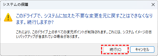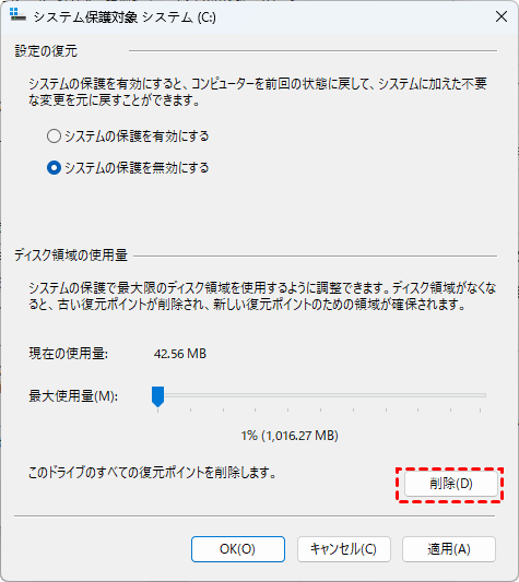 ステップ 3. 「削除」をクリックし、該当ドライブの全復元ポイントを消去します。