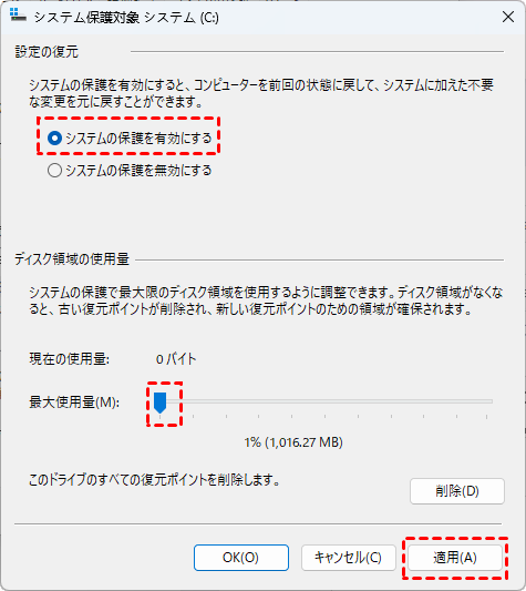 ステップ 3. 「復元の設定」で「システムの保護を有効にする」オプションをチェックし、必要に応じて復元ポイント用のディスク容量を割り当てます。その後、「適用」と「OK」をクリックして設定を保存します。