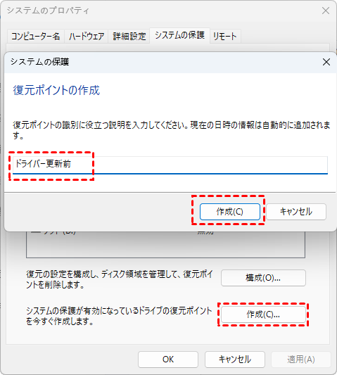 ステップ 4. 「作成」をクリックし、復元ポイントにわかりやすい名前(例:「ドライバー更新前」)を付けて、再度「作成」をクリックします。