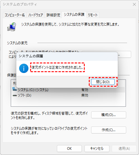 ステップ 5. Windowsが復元ポイントの作成完了を確認するまで待ちます。