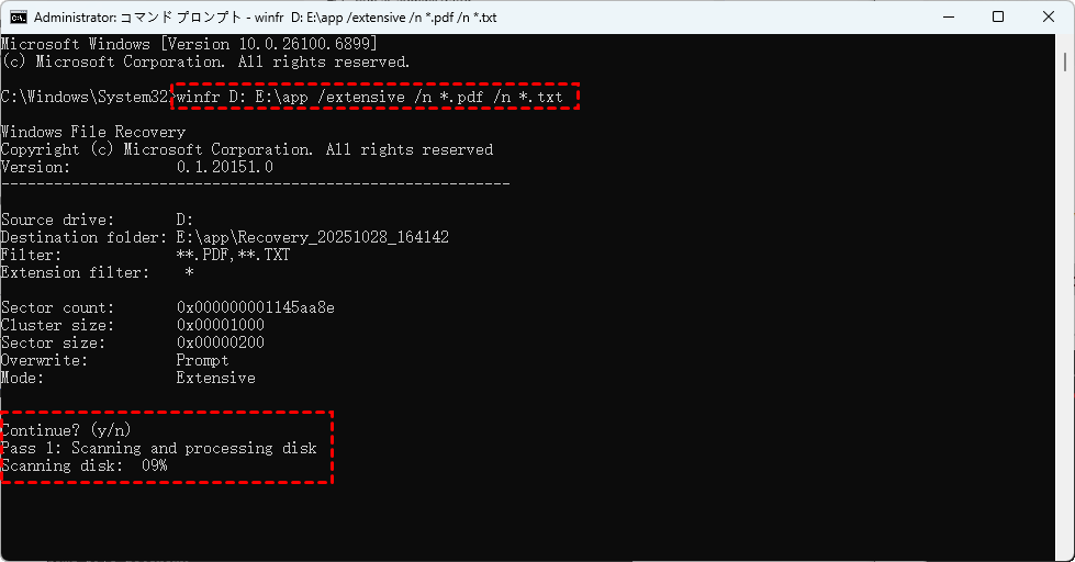このコマンドの動作:D:ドライブを深くスキャンし(/extensiveモード)、削除されたPDFファイルとTXTファイルを探します。復元されたファイルはすべてE:ドライブに保存されます。