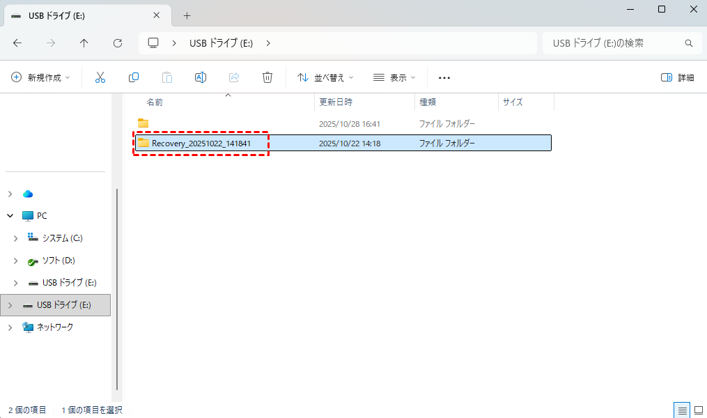 復元したいファイルやフォルダの横にあるチェックボックスをオンにします。「復旧」をクリックし、復元先のフォルダ(※復元元ドライブとは異なるドライブである必要があります)を選択してください。処理が完了するまで待機します。
