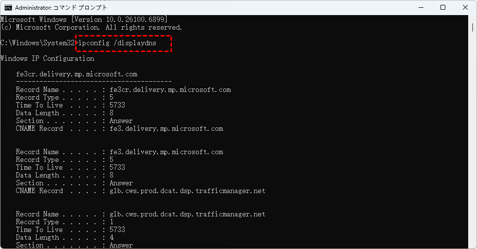 ステップ 2:コマンド「ipconfig /displaydns」を入力し、Enterを押します。これにより、最近解決されたすべてのドメイン(例:google.com)のリストが表示されます。