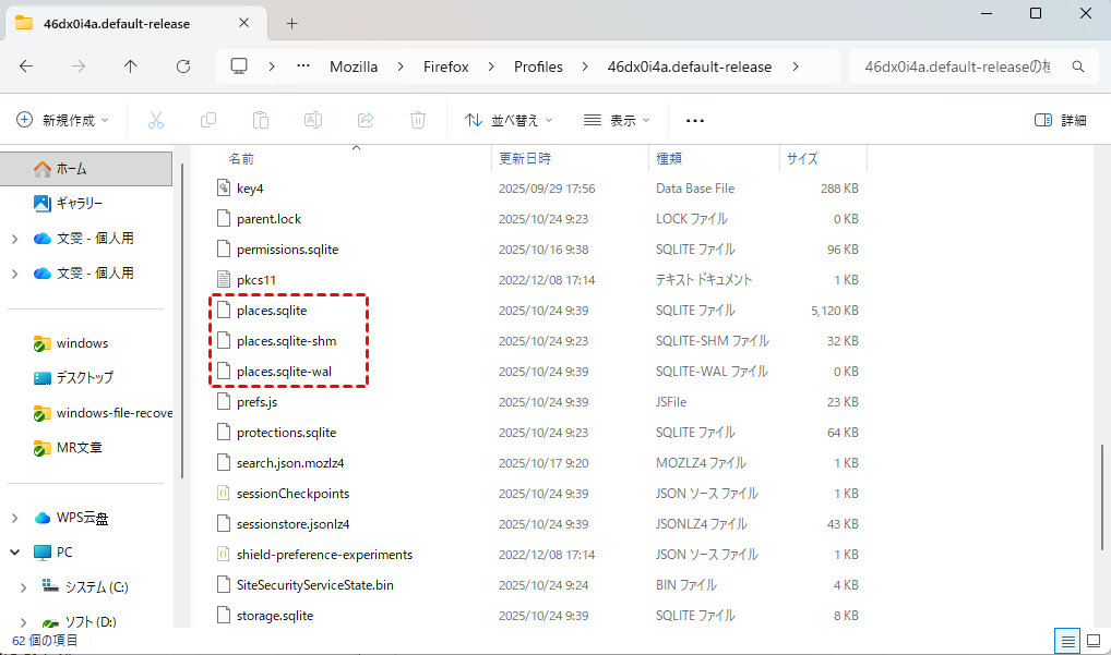 - places.sqlite-wal:一時ログ(最近の変更が含まれている可能性あり)。