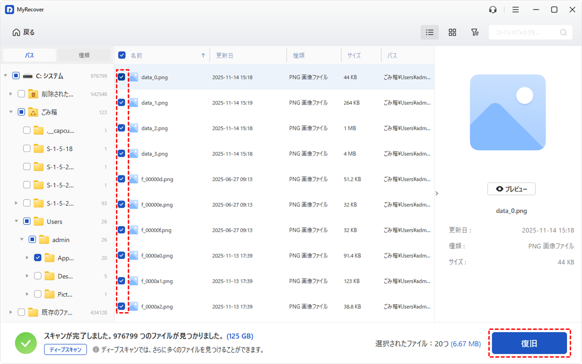 ステップ 3:復元可能なリストから復元したいファイルを選択し、「復旧」をクリックします。