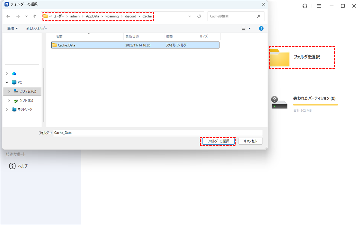 ステップ 2:「フォルダを選択」を選び、Discordのキャッシュフォルダを選択して失ったキャッシュファイルをスキャンし、「スキャン」をクリックします。