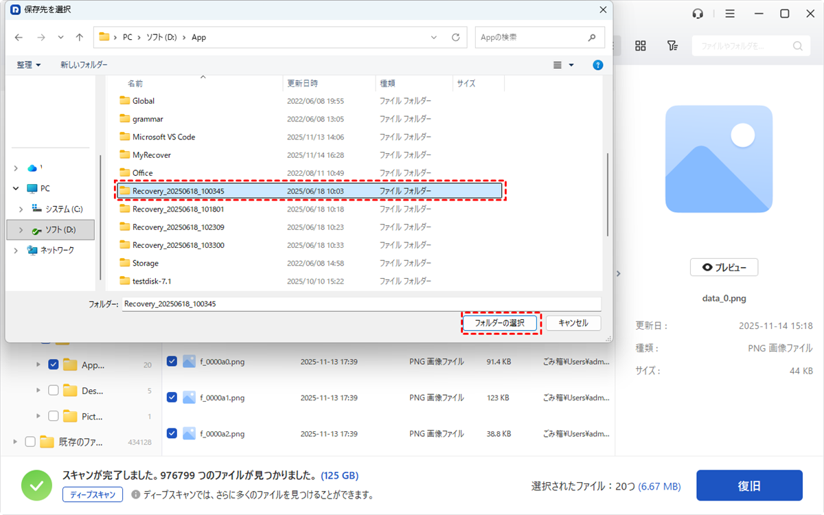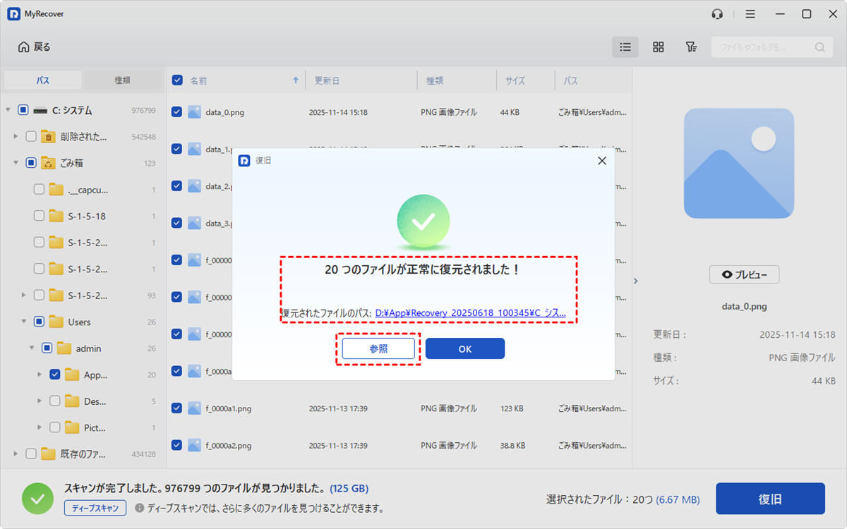 処理が完了すると、「ファイルが正常に復元されました」というメッセージが表示されます。「参照」ボタンまたは保存先フォルダのパスをクリックして、復元されたファイルを確認できます。目的のファイルがすべて復元されていることを確認した後、それらをDiscordのキャッシュフォルダにコピーして貼り付けます。