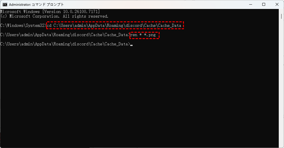 「ren * *.png」と入力し、Enterキーを押してキャッシュファイルを画像に変換します。