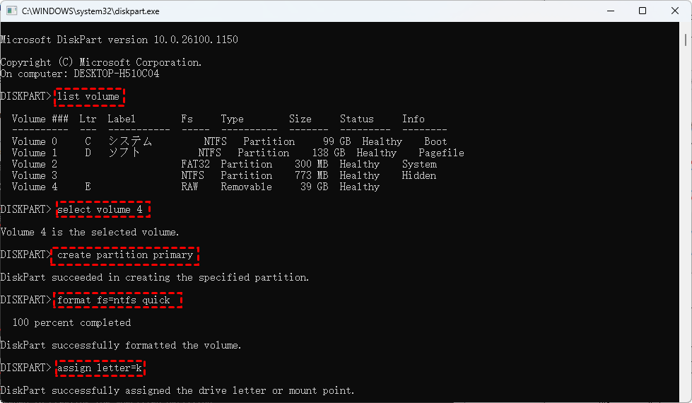 6. ドライブ文字を割り当てます:assign letter=K(「K」は他の利用可能な文字に置き換えてください)。