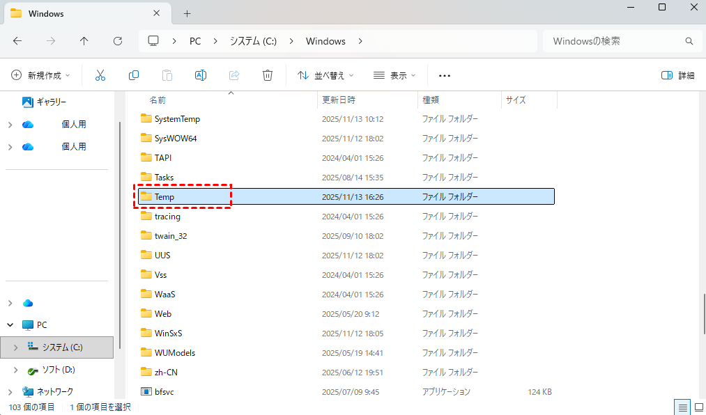 ステップ 1. Win+Eキーを押し、「C:>Windows>Temp」に移動します。