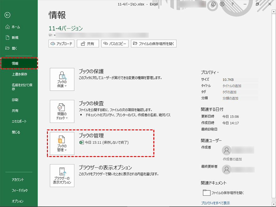 ステップ 3:「ブックの管理」の下を確認し、(保存せずに閉じたとき)とマークされたファイルを見つけます。