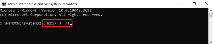 ステップ 2. CMDが起動したら、「CHKDSK X: /f」と入力し、Enterキーを押します(Xは対象デバイスのドライブレターに置き換えてください)。