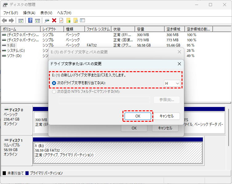 ディスクの管理を開き、外付けドライブを右クリックして「ドライブ文字とパスの変更...」を選択します。ドライブ文字が割り当てられていない場合は「追加」を、既存の文字を変更する場合は「OK」をクリックし、リストから新しい文字を選択してください。
