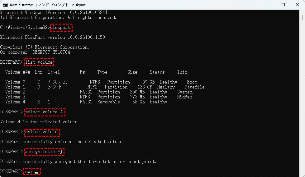 「4」は該当ドライブのボリューム番号に、「J」は使用可能な任意のドライブ文字に置き換えてください。