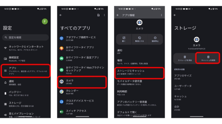 ギャラリーアプリに溜まった古いキャッシュが原因で、新しい写真が読み込めずSDカードの写真が表示されない状態を修復する必要が出てくることがあります。以下の手順でキャッシュを削除しましょう。