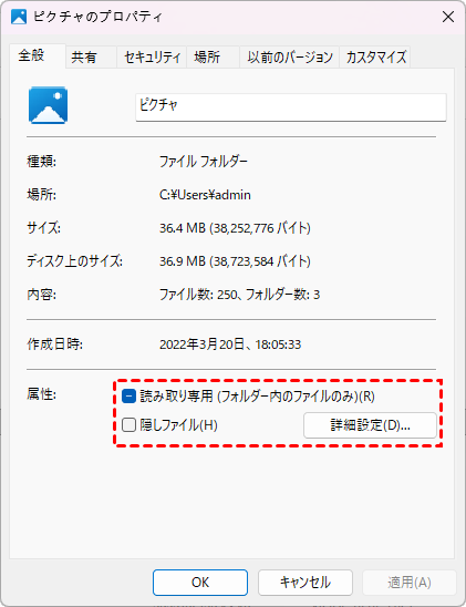 ステップ 4:スイッチがないタイプのSDカードの場合は、パソコンに接続してSDカードのドライブを右クリックし「プロパティ」から「読み取り専用」のチェックが外れているか確認します。