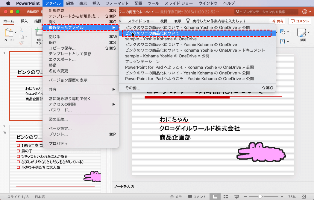 AutoRecoveryフォルダから最近のファイルをコピーし、PowerPointで開きます。