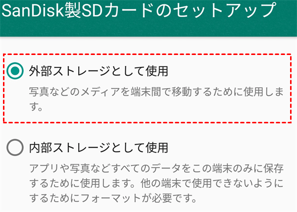 - 内部ストレージとしてフォーマットされると、SDカードは暗号化され、フォーマット時に使用したデバイスでのみ利用可能になります。SDカードを取り外すと、そこに保存されたアプリやデータにアクセスできなくなる可能性があります。