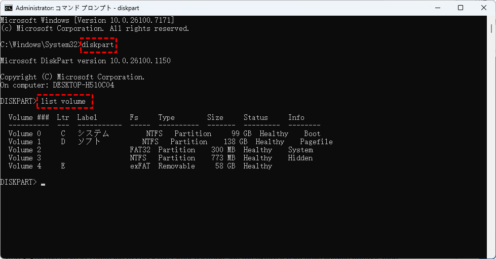 ステップ 3:「diskpart」コマンドを実行し、コピー元のパーティションと外付けHDDのボリューム番号を確認し、メモしておきます。以下のコマンドを入力します: