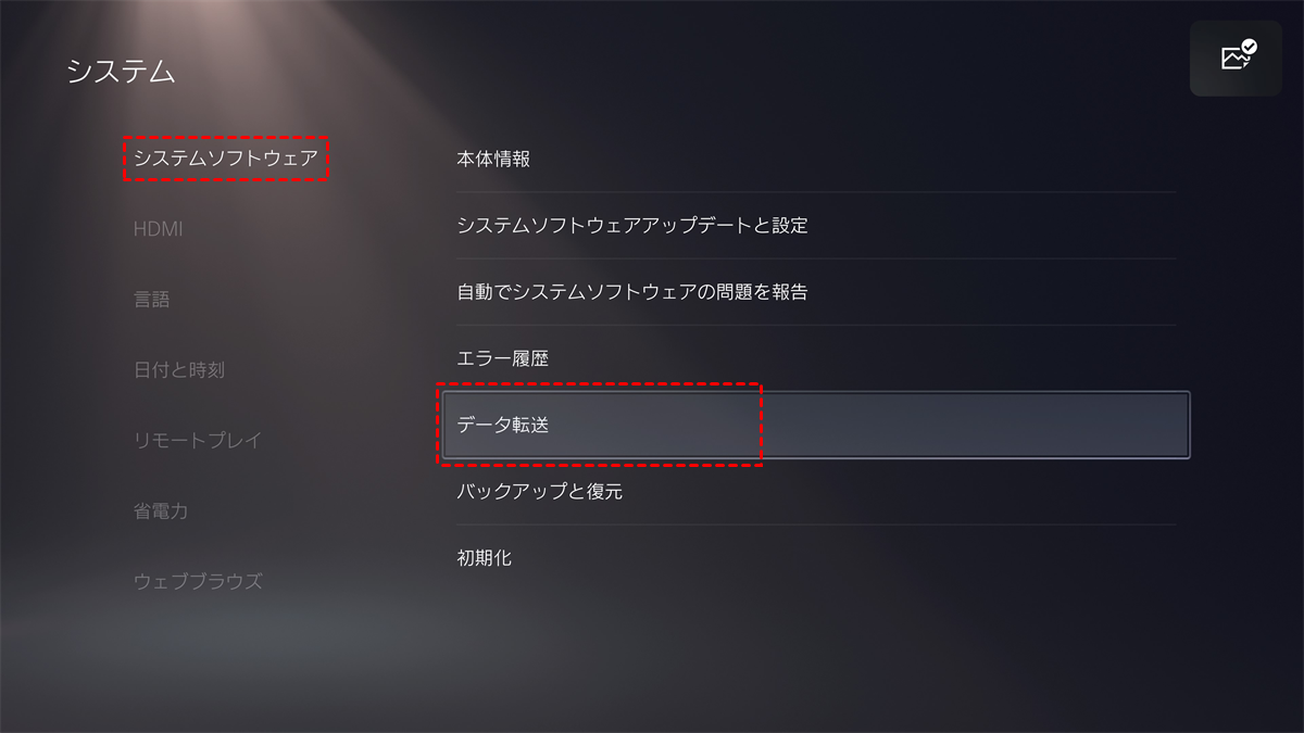 ステップ 3:新しいコンソール(PS5)で「設定」>「システム」>「システムソフトウェア」>「データ転送」へ進みます。